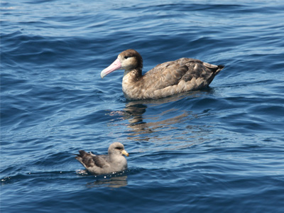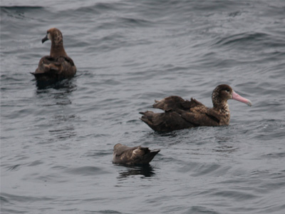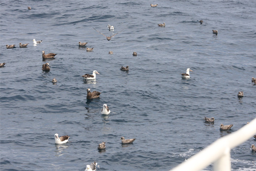 17時半位で天気もよくないこともあり、暗くなってきたので終了。 翌日は4時から。起きると数十羽のフルマカモメが船の周りに。 なんか動きがかわいい。普通にみてたらフルマカモメをかわいいだなんて思わないなぁと 思いつつ。 霧が濃く、あまり先が見えるような状態ではなかったのが残念。 6時に朝食。食べ終わった後、船尾で鳥を見ていたら、船の周りにあつまるフルマカモメ、 コアホウドリ、クロアシアホウドリに混じってアホウドリが・・・。