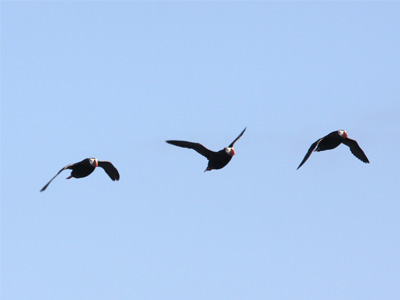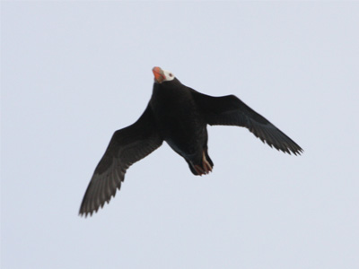 シャチ。遠目では、ニョキっとでっかい二等辺三角形の背びれが水面から出てきては消えるのが 見え、それだけでも感嘆ものだったのに、船のすぐ横、ぶつかるんじゃないかというところまで 寄ってきて、その大きさに圧倒されました。 いやー本当にシャチも良かった。 そしてエトピリカの謎の行動。 どこからともなく、船に向かって飛んできて、船の周りを2〜3周わざわざしてから飛び去る。 あきらかにこっちを見ている動きをしているのも見て取れるし、わざわざバタバタと旋回して 船の上を通る。何しているんだか?好奇心旺盛なのだろうか? こんな動きが今回4、5回ありました。