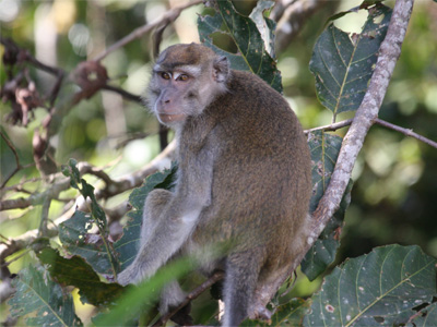 オラウータン さらにオラウータンの親子も見れて、目的を忘れかけてた頃、また運転手さんが、 「hornbill」と言ってボートを飛ばしだし、その先にはムジサイチョウがいました。 運転手さん凄過ぎます! その後、 これぞ、テングザルという雄の鼻が立派なやつを間近に。