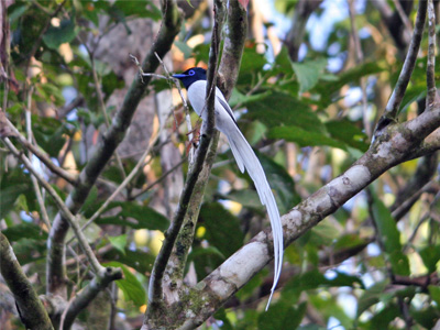 アジアヘビウ 日本のウに比べると頭も首も細く、格好良く見える、、、 泳いでる時はこんな感じで、ほとんど体は出さず、首だけ。細いので枝のよう。 朝なので、鳥の鳴き声もいろいろと聞こえてきます。 なかでもかなりの声量のある声がだんだんと近づいてくる鳥が。どうもハシリカッコウらしい。 しばらく、静かに待ってみましたが残念ながら姿は見れず。 これ以外にヤイロチョウなどいろいろ聞えてきて、そのうちに「ピョッピョッピョッピョッピョッピョッ」 と鳴き声が、すぐ近くまできました。 声する方向の緑の中を凝視していると、白いリボン?!が飛び出しました。 現地のガイドさんから「Paradise flycatcher」との声が。 し、白いサンコウチョウ!