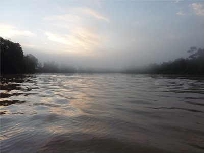 霧は1時間程で晴れ、支流へボートは進みます。 支流に入るとまず、ヘビウが。