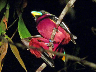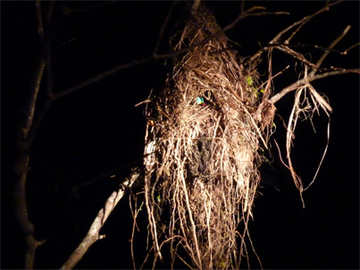 枝で寝るクロアカヒロハシ下から 下から見ると名前の通り、クチバシの幅が広いのがよく分かります。 これ以外に驚きの出来事が2つ。 これまでのクルーズも同じ運転手さんで、目が良いのはわかってましたが、今回結構離れたところから見つけたのは、 寝てるサイホウチョウ。 かなり小さい鳥で、これが頭から半分見えない状況なのに。そもそも昼でも鳥だってわかりにくかったのに、どうして分かるのだろう? またしても凄過ぎます。 川幅も数十メートルある反対の岸側からですよ、夜に。 そしてもう一つ。 これまた、遠くから見つけたちっちゃいワニ。 ライトを他の人に持ってもらって、何するかと思ったらワニに向かって勢い良く身を乗り出し、手づかみでワニを捕まえてました、、、 ホント凄いね、この運転手さん!