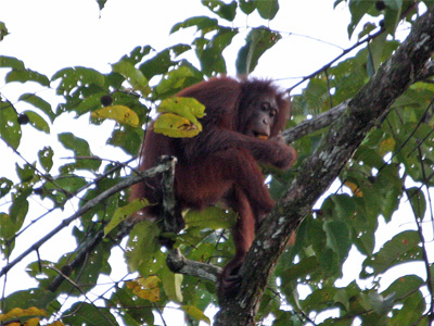 15時半になってもスコールは続き、止むまでティータイム。 食堂にはお茶とお芋の天ぷら?みたいなのが、用意されていたので、話をしながら時間を潰してました。 16時にはほぼ止んで、出発。 目的はサイチョウを5種にすること。これまでで4種が出ていて、残りの可能性の高い、ムジサイチョウ探しをすることに。 スコールで濡れた羽を乾かしているのか、枝先に結構鳥が。カンムリワシとかブッポウソウ、オウチュウカッコウとかが枝の先端に よくとまっています。 ボートは鳥を探しながら進み、突然ボートの運転手さんが、 「オラウータン」 と言ってボートを勢い良く走らせていき、止めるとそこには確かにオラウータンが!! どれだけ目が良いんですか?と本当に感心します。第一声からかなりの距離ありましたよ? それにつけても野生オラウータンに感動。いるとは聞いていましたが、本当に見れるとは。