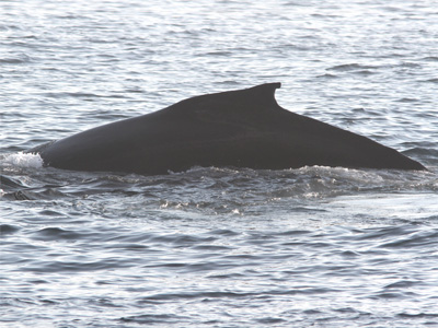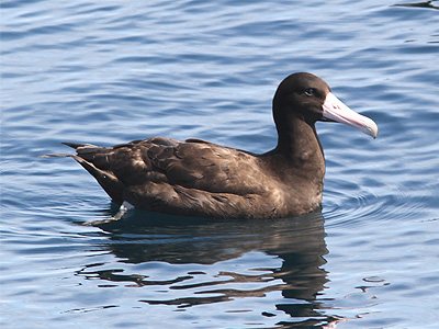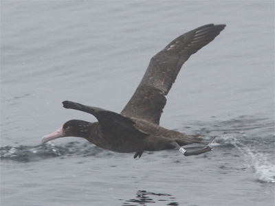 アホウドリ この個体は真っ黒でした。1年目か2年目でしょうか? 見るものはあとはシャチとツノメドリ。ツノメドリはちょっと難しいけど、シャチならと 双眼鏡で遠くまで探す。シャチのオスの背ビレならかなり遠くても分かることは、前回乗った 時に経験積み。海から突き出る二等辺三角形を探す。 無駄に遠くを探すと、ウミツバメ類が飛んでいるのが目に入って、これはこれで楽しいのですが、 シャチはなかなか見つからない。日も傾き、ちょっとあきらめな感じになった時、遠くで突き出る 三角形を発見。潮を吹いているのもかろうじて見える。 しかし遠い。4キロ位あるのではないかとのこと。そんな時、前方に鳥の群れが。 数万ものハシボソミズナギドリの群れ。海へ降りているもの、渦を巻いて飛び回っているもの まさに「うじゃうじゃ」という感覚。そしてザトウクジラまでも姿を現しました。