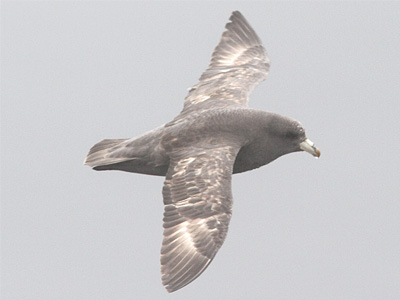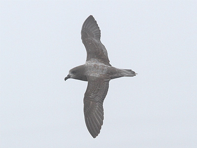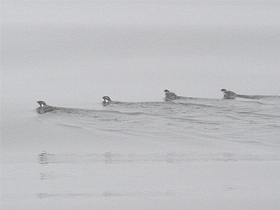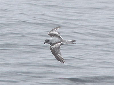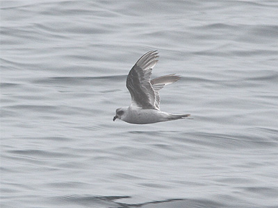 その日の夜、船の甲板に出ると「ピュルッ、ピュルッ、ピュルッ」と鳴き声が。 どうもコシジロウミツバメらしい。 船の明かりに集まって来ている様で、1羽や2羽ではない数が船の周りを鳴きながら飛び回っているよう でした。コシジロウミツバメだけではなく、ハイイロウミツバメも飛んでいるのを肉眼で確認。 もう触れるのではないかという距離まで飛んできたりしてました。食い入ってみていると、背中というか横っ腹に ウミツバメがぶつかってきたし・・・種は分かりませんでしたが、特に何事もなく飛び去りました。結構頑丈なのですね・・・ 最終日 場所は色丹島沖まで戻ってきて、最終日だけでも霧が晴れることを願いながら外を見たら、やっぱり霧。 それでも、船が停まっているとフルマカモメなどが寄ってきます。