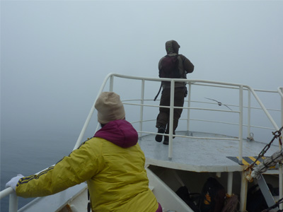 ロサルゴサ号に乗ってきました。この船は北方領土のビザなし交流船で使われている船なのですが、 老朽化のため後継船が建造されているとのこと。今後この船がどのようになるかわかりませんが、 交流船では使われなくなることもあり、最後のクルーズになるということ、今回は択捉島沖まで 行くということで、滅多に行けるような場所ではないことから、乗ってきました。 関東では30度を超える暑さの中、根室は20度に満たない、とてもすごしやすい温度。しかし、船に 乗り甲板にいると、当然風を受け続けるのため体感温度は急に下がります。船に乗り込む前に防寒着 を身につけ乗船。 この船は、約500トンで海で生き物を観察をするのに大きすぎず、小さすぎず丁度良い大きさで、あまり 揺れないし鳥は近いので、期待をこめての乗船しました。 船長さんから船の説明を聞きつつ出航。天候は、雨は降っていませんが、あいにくの霧。霧のため船から近いところしか見れませんが、しばらくするとウトウやハイイロミズナギドリ、 ハシボソミズナギドリ。その他にウミガラスやウミスズメ、カンムリウミスズメ、トウゾクカモメ。 段々と外洋性の鳥が出始めたお昼、フルマカモメやコアホウドリも出始め、若いですがエトピリカも 姿を見せ始めました。
