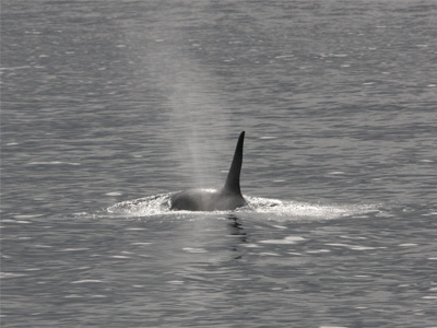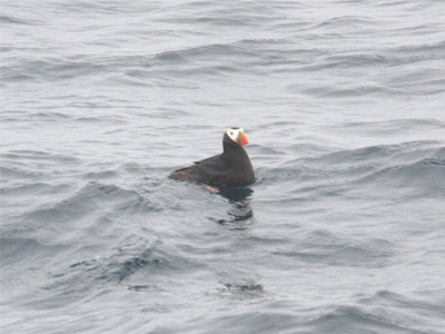 シャチ。遠目では、ニョキっとでっかい二等辺三角形の背びれが水面から出てきては消えるのが 見え、それだけでも感嘆ものだったのに、船のすぐ横、ぶつかるんじゃないかというところまで 寄ってきて、その大きさに圧倒されました。 いやー本当にシャチも良かった。 そしてエトピリカの謎の行動。 どこからともなく、船に向かって飛んできて、船の周りを2〜3周わざわざしてから飛び去る。 あきらかにこっちを見ている動きをしているのも見て取れるし、わざわざバタバタと旋回して 船の上を通る。何しているんだか?好奇心旺盛なのだろうか? こんな動きが今回4、5回ありました。