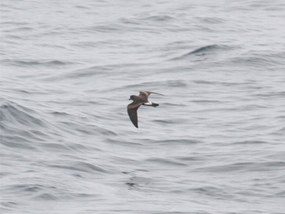 この存在を知ってから行きたい行きたいと思っていた歯舞・色丹クルーズツアー。 日程を気にしていたら、今年は連休に絡めて実施するということで、これなら 「1日休めば行ける!」ということで、行ってきました。 初日はバスで釧路から途中に鳥見をしながら根室までバス。 天気はイマイチでしたが、バスの中からも油断してるといろいろ出るし、外の景色も 新鮮で、牛と馬とかタンチョウとか道路のすぐ脇にみれて北海道〜って感じ。 見ていて飽きないです。 まずは厚岸湖。ここではコムクドリだったりアマツバメが近かったり、 湖の方は居残り組みのスズガモなど。 次に霧多布、アゼチの岬に。結構寒い・・・ 霧多布では、浮きものを探すもカモメとウのみしかなかなか見当たらず。 ヒメウを見てたら近くで何か浮いてるものがいるらしい。 探すと確かにいる・・・がちょっと遠い。ウではないく、全身真っ黒。 ケイマフリ?と思わないでもないが、なんとなくシルエットが違う気がする。 目の周りも白くない。ときどき羽ばたくと、上面も真っ黒。ウミバトの特徴である白 い部分がない。ん〜と思っていたら、ウミバトの亜種の中で白味があまりない固体が いるらしい。消去法でいくとコレかな?自信はないけど・・・ アゼチの岬では、エトピリカのデコイの周りにケイマフリがいくつか。 ケイマフリの赤い足はやっぱり素敵です。 それと、岩場のとこにオジロワシ。遠くにウトウが飛んでいる。そんな中なぜかトド が1頭岩場に寝転がっているのを確認。こんな時期にもいるのかぁ。 岩場の草むらでは、やはりオオジュリン、ノビタキ、シマセンニュウ、コヨシキリなど。 エトピリカは見れませんでしたが、明日のメインに期待。 その後、風蓮湖に。霧が濃い・・・ エゾセンニュウが鳴きまくってましたが当然見れず。いつになったら姿を見れるかなぁ。 後は、エゾシカいたり、タンチョウいたり、ミヤコドリいたり。本日はコレで終了。 7/19。ついにクルーズに。朝起きると霧が濃い。危険な香りを感じつつ準備して根室港に。 乗る船はロサルゴサ号。思っていたより少し小さい船でちょっと期待感アップ。 やっぱり小さい船の方が鳥は近いし。 乗船して船長の話などを聞いているうちにいつの間にか出港。スコープを持ってきていた けど使わなくてもよさそうなので早々に端に置いて、双眼鏡で勝負。 ちょろちょろとミズナギドリが出だしていたら、いきなり不意を付いてツノメドリが飛び 出すわ、ウトウに混じってウミガラスが浮いてる。テンションが上がってきたところで、 数万羽のハシボソミズナギドリの群にぶつかりました。 何といっていいかわからず、とにかく「スゴイ」の一言。水面1面が黒くミズナギドリで うまっており、一斉に飛び立つ場面は圧巻でした。写真を何枚か撮ってみたもののこういう のは生で見ないとないと伝わらないかな。もしくはこういうときビデオがあったらと思って しまいます。そんな中、出港して1時間を過ぎたあたりでエトピリカが出現。飛んでいる姿ですが初認。 白い顔に派手な嘴がいい感じ。 その後、エトピリカの幼鳥や冬羽と思われる固体も確認。 ふと船の周りを見ると、いつの間にか、まわりはフルマカモメだらけに。近いのはやっぱり 細部まで見れてやっぱりいい。 コアホウドリ、クロアシアホウドリも姿を見せてくれるようになり、羽ばたきが早くて、 不規則な動きをしている小さいのが出現。コシジロウミツバメでした。その直後に、 ハイイイロウミツバメも確認。 遠いとコシジロウミツバメの腰が白いのが目立って見えるくらいですが、船の近くにきた 固体を見たとき、双眼鏡でも上面の線がくっきり入ってるのが見えたのはちょっと感動。