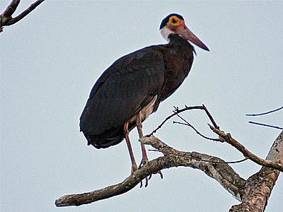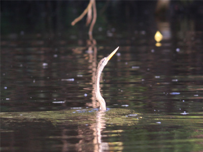 霧は1時間程で晴れ、支流へボートは進みます。 支流に入るとまず、ヘビウが。