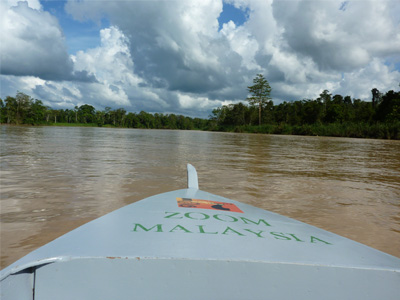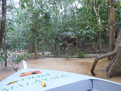 テングザル 鳥もコウハシショウビンやルリカワセミなどが姿を見せてくれます。 そのうち、雲行きが怪しくなり、ボート上にいるので不安に思っていると、 そこへ、私たちのボートを抜かしていくボートがなにかこちらに話しというかジェスチャーというかをしていったら、 私たちのボートも急にスピードアップ。何事かと聞いてみるとゾウがでているとのこと。駆けつけてみるとボートが2艘、 岸に向かって突っ込んで止まっています。 見ると、ゾウが!