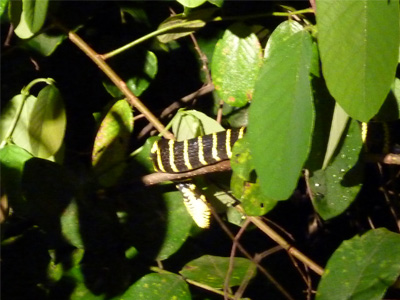 コブハシコウ これまでも飛んでる姿はみれてましたが、降りてるところをバッチリと。 猿はこの他に、シルバーリーフモンキーとクリイロリーフモンキーの2種も。 そして、最後の最後に高いところを飛ぶサイチョウが。 シワコブサイチョウでした。 なんと6種目に。 出来すぎな感じでクルーズが終了。そして、前日に引続き、ナイトクルーズへ。 前日同様、ボートの運転手さんが、生き物を探してくれ、小さなカエルとかマレーウオミミズクを見つけてくれるのは良いのですが、 今回はヘビを何度も。 しかも、ボートが寄りすぎというか、すぐ頭の上までよらなくても、、、