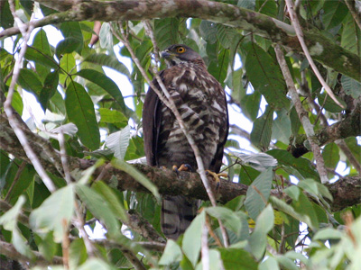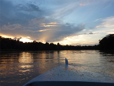 15時半になってもスコールは続き、止むまでティータイム。 食堂にはお茶とお芋の天ぷら?みたいなのが、用意されていたので、話をしながら時間を潰してました。 16時にはほぼ止んで、出発。 目的はサイチョウを5種にすること。これまでで4種が出ていて、残りの可能性の高い、ムジサイチョウ探しをすることに。 スコールで濡れた羽を乾かしているのか、枝先に結構鳥が。カンムリワシとかブッポウソウ、オウチュウカッコウとかが枝の先端に よくとまっています。 ボートは鳥を探しながら進み、突然ボートの運転手さんが、 「オラウータン」 と言ってボートを勢い良く走らせていき、止めるとそこには確かにオラウータンが!! どれだけ目が良いんですか?と本当に感心します。第一声からかなりの距離ありましたよ? それにつけても野生オラウータンに感動。いるとは聞いていましたが、本当に見れるとは。