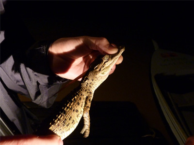 枝で寝るクロアカヒロハシ下から 下から見ると名前の通り、クチバシの幅が広いのがよく分かります。 これ以外に驚きの出来事が2つ。 これまでのクルーズも同じ運転手さんで、目が良いのはわかってましたが、今回結構離れたところから見つけたのは、 寝てるサイホウチョウ。 かなり小さい鳥で、これが頭から半分見えない状況なのに。そもそも昼でも鳥だってわかりにくかったのに、どうして分かるのだろう? またしても凄過ぎます。 川幅も数十メートルある反対の岸側からですよ、夜に。 そしてもう一つ。 これまた、遠くから見つけたちっちゃいワニ。 ライトを他の人に持ってもらって、何するかと思ったらワニに向かって勢い良く身を乗り出し、手づかみでワニを捕まえてました、、、 ホント凄いね、この運転手さん!