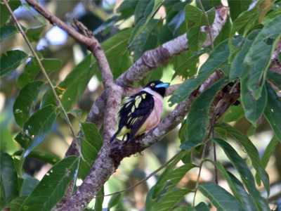 生ワニ革を触りました。もっとゴツゴツした感じを予想してましたが、以外とソフトビニル人形みたいな手触り。 4日目 前日より深い霧がでていましたが、2日目の早朝クルーズで、この旅の最後クルーズ。 すでにこれまで、いろいろ出てしまったので、まだ未確認の鳥をだすのは難しいとガイドさんはおっしゃっていましたが、 またまた運転手さんが、見つけてくれました。「Trogon」との声。 まぁ、私はTrogonがどんなのかもすぐにピンとはきませんでしたけどね・・・ 初めはよくわからなかったのですが、飛び出してきて姿が見えるところに出てきてくれました。