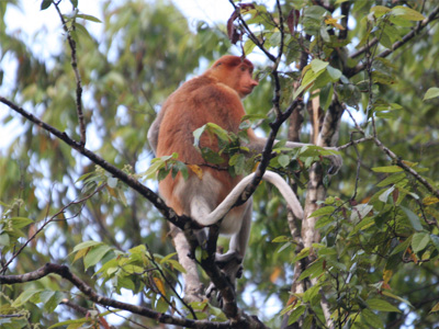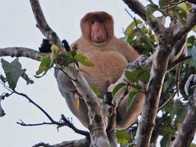 オラウータン さらにオラウータンの親子も見れて、目的を忘れかけてた頃、また運転手さんが、 「hornbill」と言ってボートを飛ばしだし、その先にはムジサイチョウがいました。 運転手さん凄過ぎます! その後、 これぞ、テングザルという雄の鼻が立派なやつを間近に。