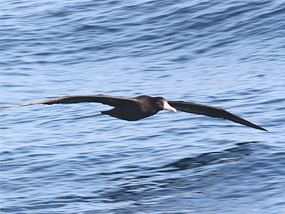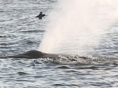 アホウドリ この個体は真っ黒でした。1年目か2年目でしょうか? 見るものはあとはシャチとツノメドリ。ツノメドリはちょっと難しいけど、シャチならと 双眼鏡で遠くまで探す。シャチのオスの背ビレならかなり遠くても分かることは、前回乗った 時に経験積み。海から突き出る二等辺三角形を探す。 無駄に遠くを探すと、ウミツバメ類が飛んでいるのが目に入って、これはこれで楽しいのですが、 シャチはなかなか見つからない。日も傾き、ちょっとあきらめな感じになった時、遠くで突き出る 三角形を発見。潮を吹いているのもかろうじて見える。 しかし遠い。4キロ位あるのではないかとのこと。そんな時、前方に鳥の群れが。 数万ものハシボソミズナギドリの群れ。海へ降りているもの、渦を巻いて飛び回っているもの まさに「うじゃうじゃ」という感覚。そしてザトウクジラまでも姿を現しました。