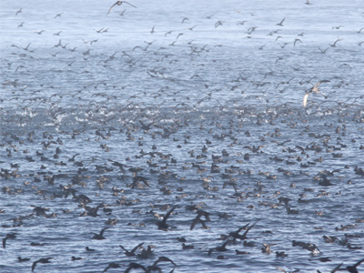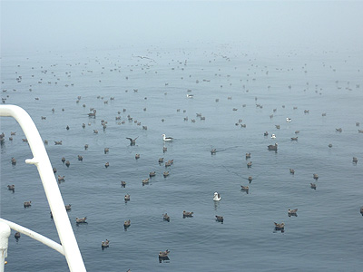 残念ながら霧は濃く、島は影も形も見ることが出来ませんでした。 ここから根室に向かって引き返す行程に。 この日は、面白い光景を見ることが出来ました。 フルマカモメとヒレアシシギがかたまって採餌しているのですが、遠目ではなにも見えません。 とりあえず、写真で何か写らないかとカシャリ。