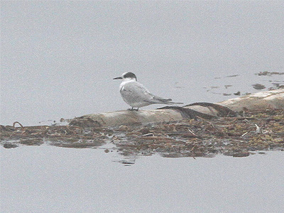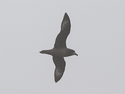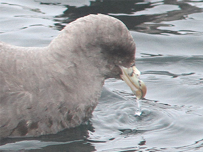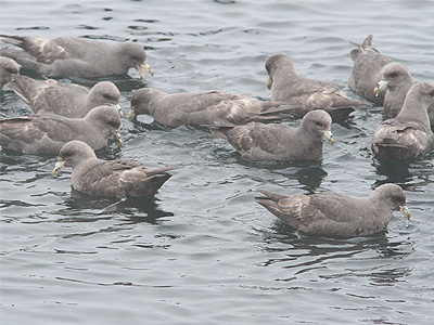 その日の夜、船の甲板に出ると「ピュルッ、ピュルッ、ピュルッ」と鳴き声が。 どうもコシジロウミツバメらしい。 船の明かりに集まって来ている様で、1羽や2羽ではない数が船の周りを鳴きながら飛び回っているよう でした。コシジロウミツバメだけではなく、ハイイロウミツバメも飛んでいるのを肉眼で確認。 もう触れるのではないかという距離まで飛んできたりしてました。食い入ってみていると、背中というか横っ腹に ウミツバメがぶつかってきたし・・・種は分かりませんでしたが、特に何事もなく飛び去りました。結構頑丈なのですね・・・ 最終日 場所は色丹島沖まで戻ってきて、最終日だけでも霧が晴れることを願いながら外を見たら、やっぱり霧。 それでも、船が停まっているとフルマカモメなどが寄ってきます。